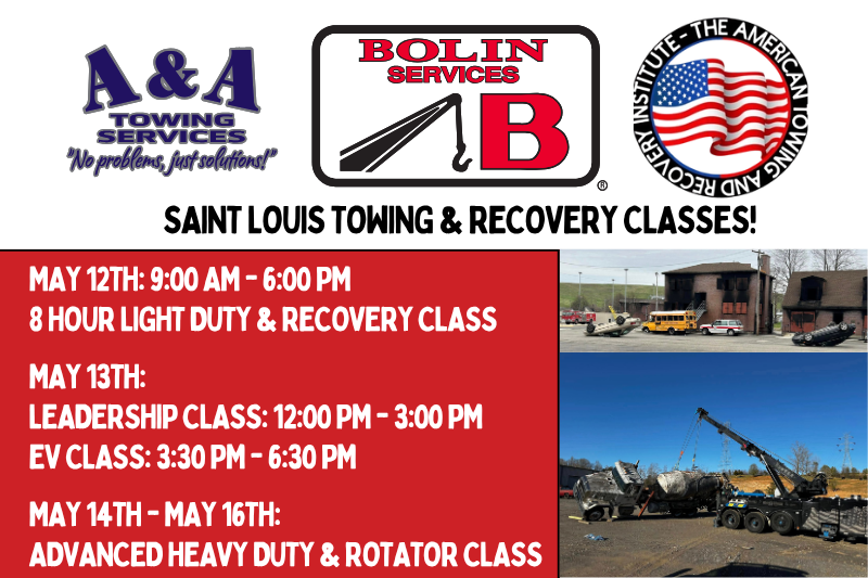 Upcoming 8 Hour Light Duty and Recovery, 3 Hour EV Certification, 3 Day Advanced Heavy Duty Towing and Recovery, with Leadership Continuing Education Classes in St. Louis, MO hosted by Bolin Services & A&A Towing.